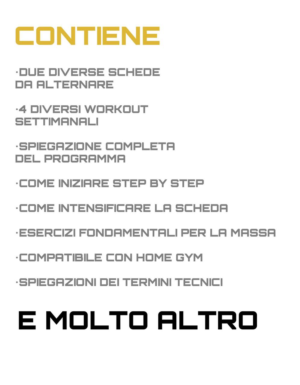 Al suo interno contiene ben due diverse schede settimanali da alternare nel tempo, più la loro versione AVANZATA con più intensità.